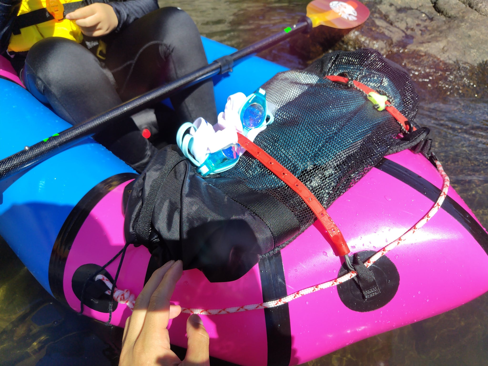 バックレストなど、舟の内側には掴めるものがありますが、パックラフト本体のチューブが太いので、いきなり水面から中を掴むのは意外と大変です。